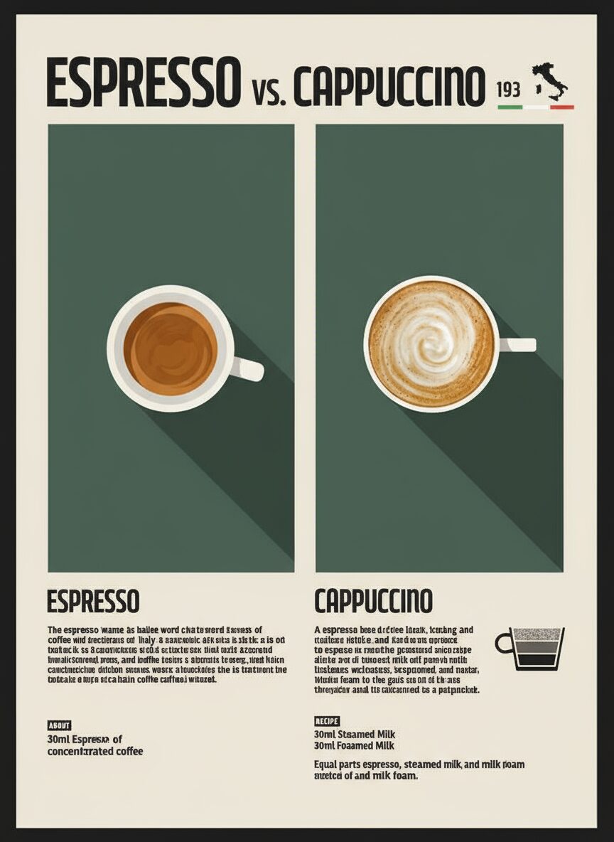 Espresso is pure coffee concentration; cappuccino is espresso plus milk and foam in roughly equal thirds, which changes both flavor and feel in the mouth. In simple terms: espresso hits bold and fast, while cappuccino feels soft, warm, and creamy without losing the coffee’s backbone.