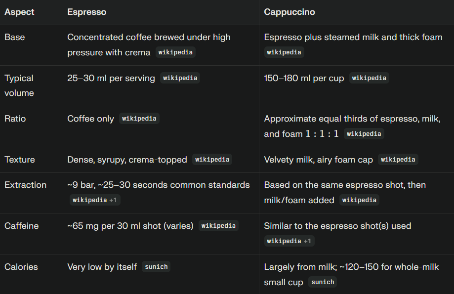 Volume: Espresso is tiny—about 25–30 ml—while a cappuccino lands around 150–180 ml, which feels like a “proper cup” without being huge.